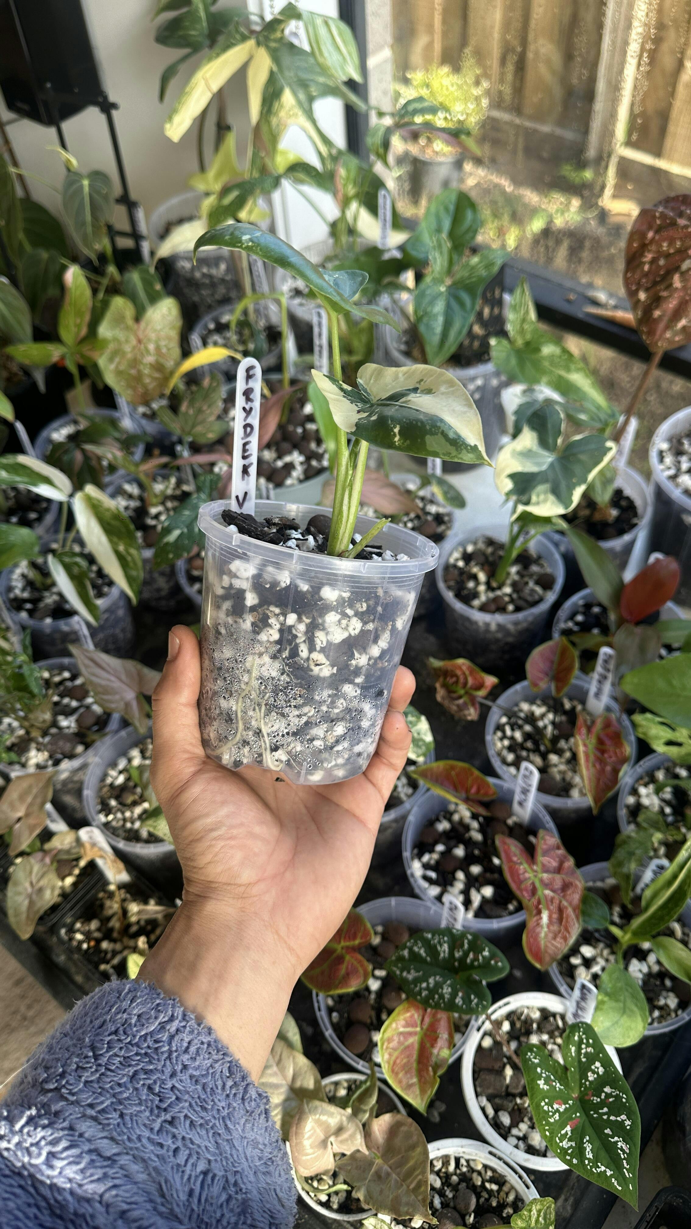 - Alocasia Frydek Variegated thrives in high humidity environments, ideally around 60-80%. Use a humidifier or regularly mist the plant if your space is dry, especially in winter months when indoor heating reduces humidity levels.