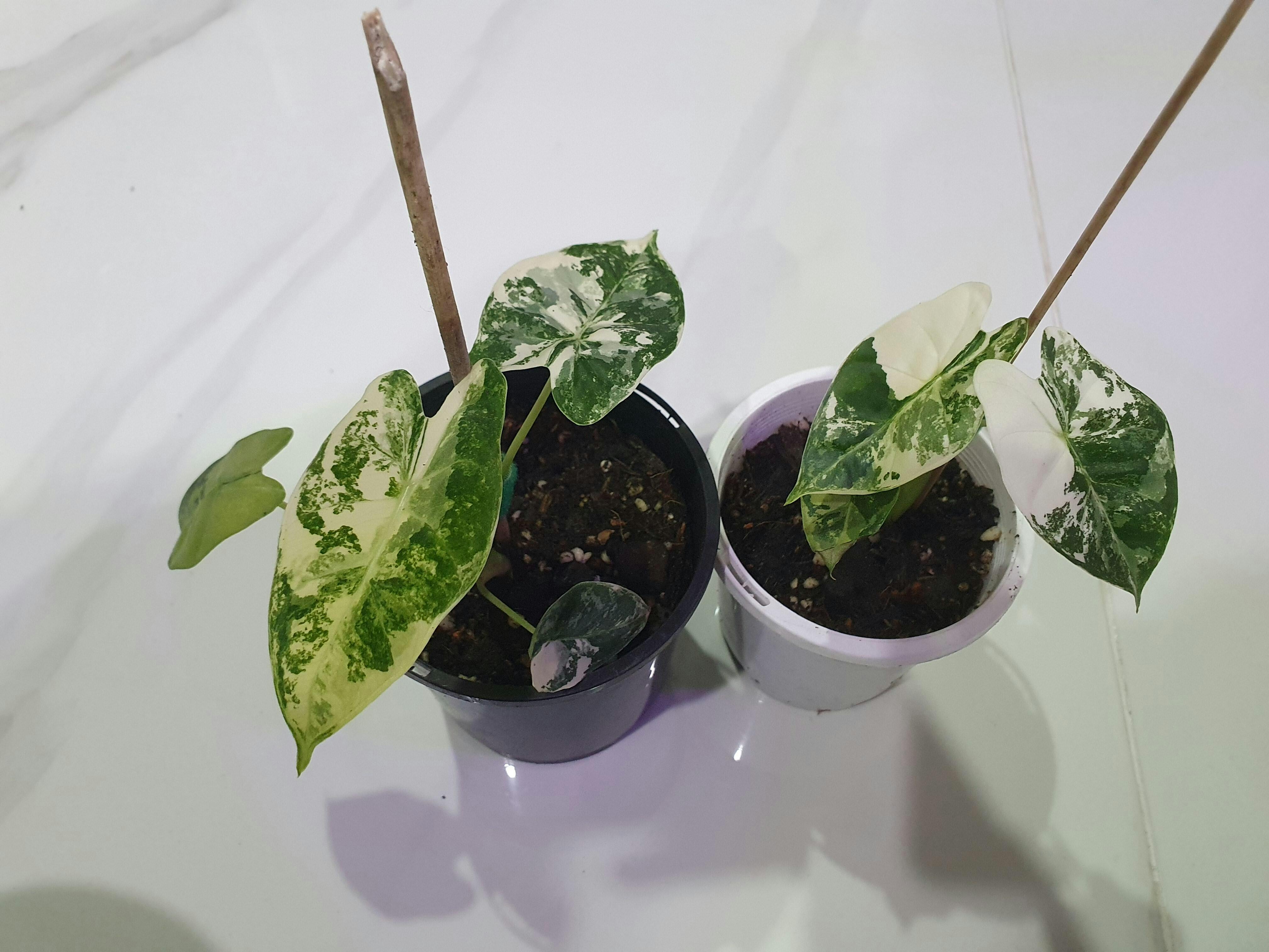 The Alocasia Frydek Variegated is a rare and highly desirable houseplant known for its striking, heart-shaped leaves and stunning variegation. The plant features deep green velvet-like leaves with bold, creamy white or yellow splashes that create a beautiful contrast. The leaves have a prominent venation that enhances the dramatic effect of the variegation. This tropical plant, with its elegant, upright growth habit, adds an exotic flair to any indoor plant collection. The variegation on each leaf is unique, making every plant a one-of-a-kind piece of living art.